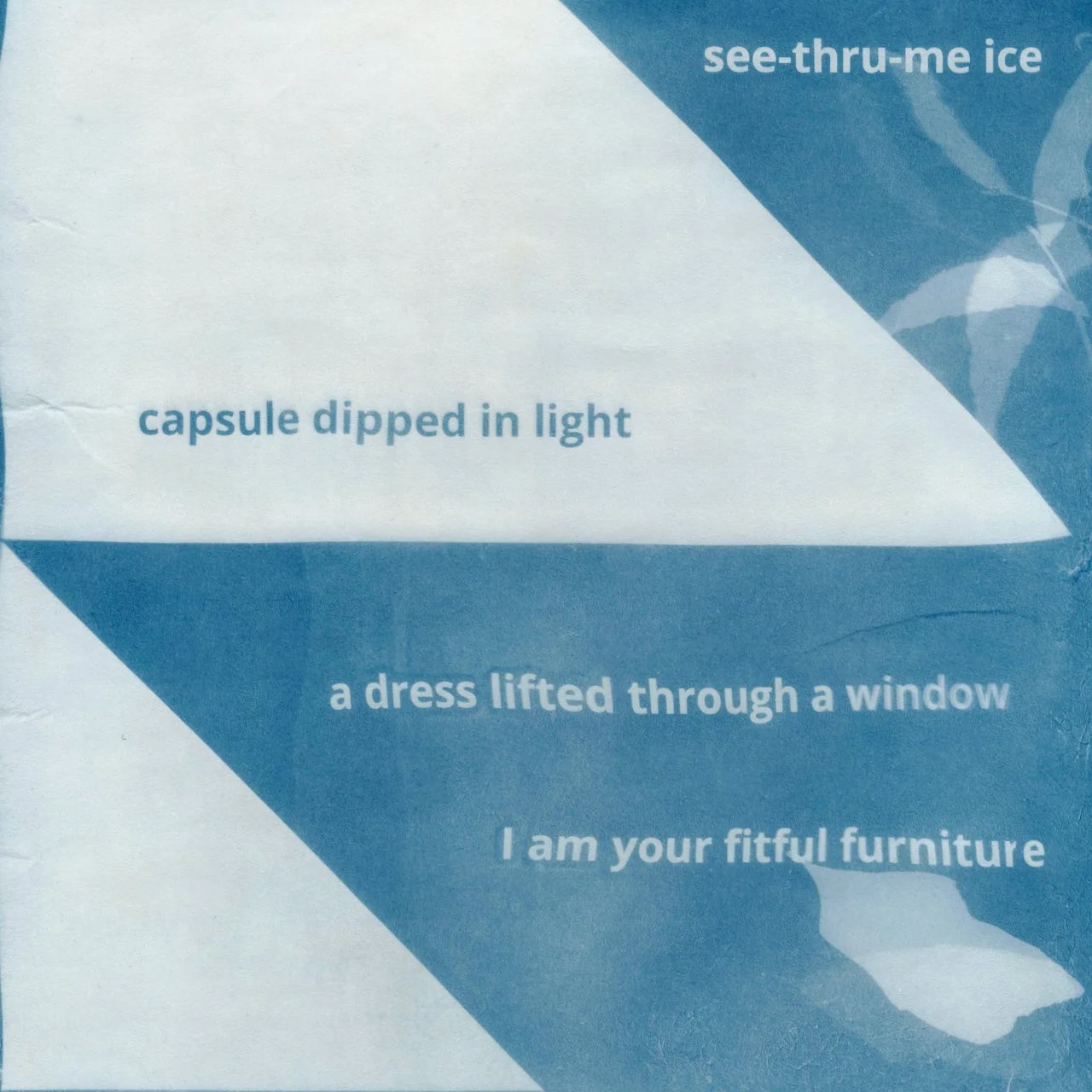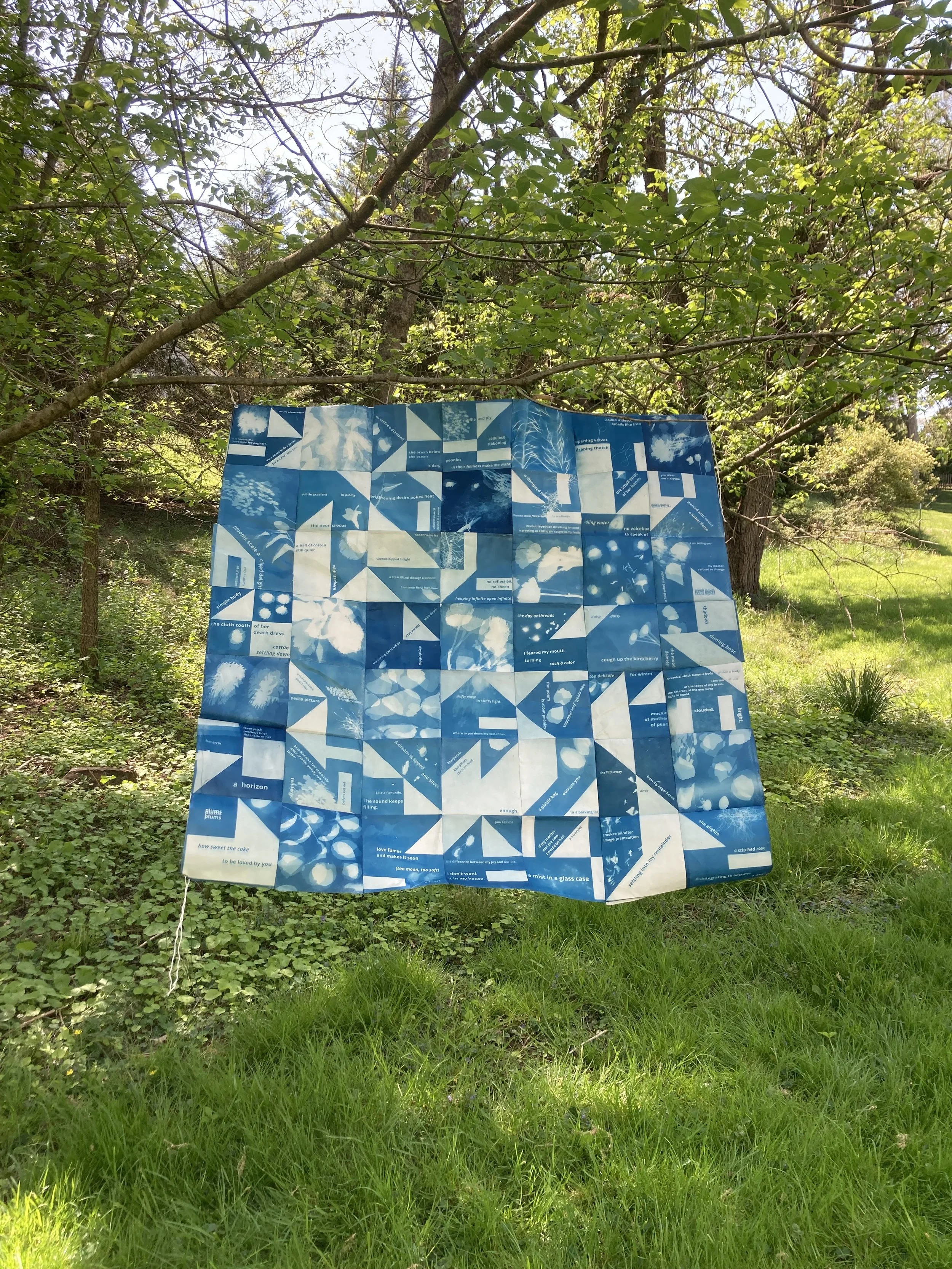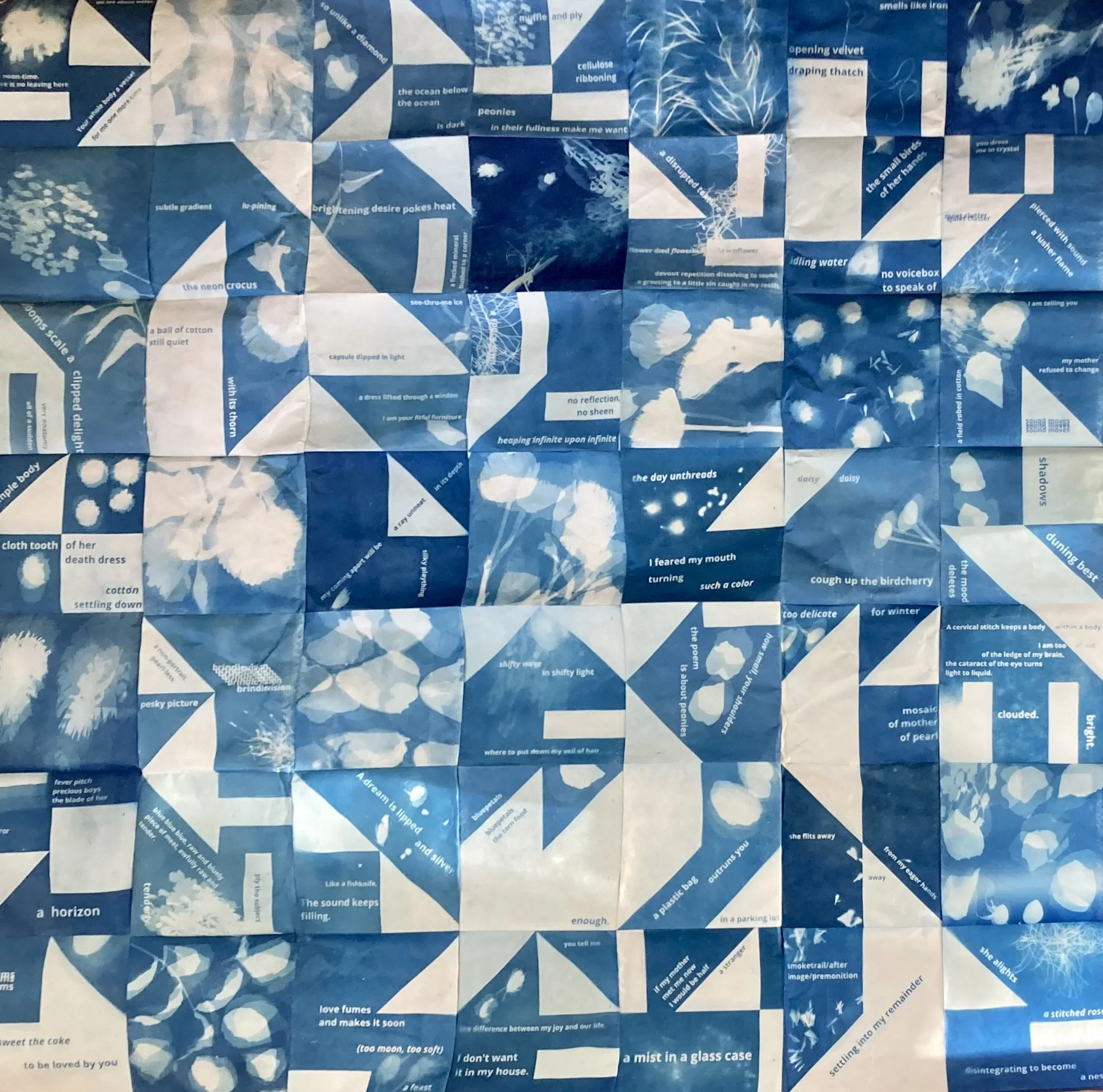 These solar-printed paper squares are made using botanicals and laser-printed negatives. They incorporate excerpts of language from the poems in my debut collection, UNDERSHORE, forthcoming from Lightscatter Press. Eventually they will be sewn together to form a quilt large enough to cover a queen-sized bed. They have been digitized and paired with audio recordings of the poems as part of the book’s multimodal presentation—view that project here. Learn more about the cyanotype printing process here.